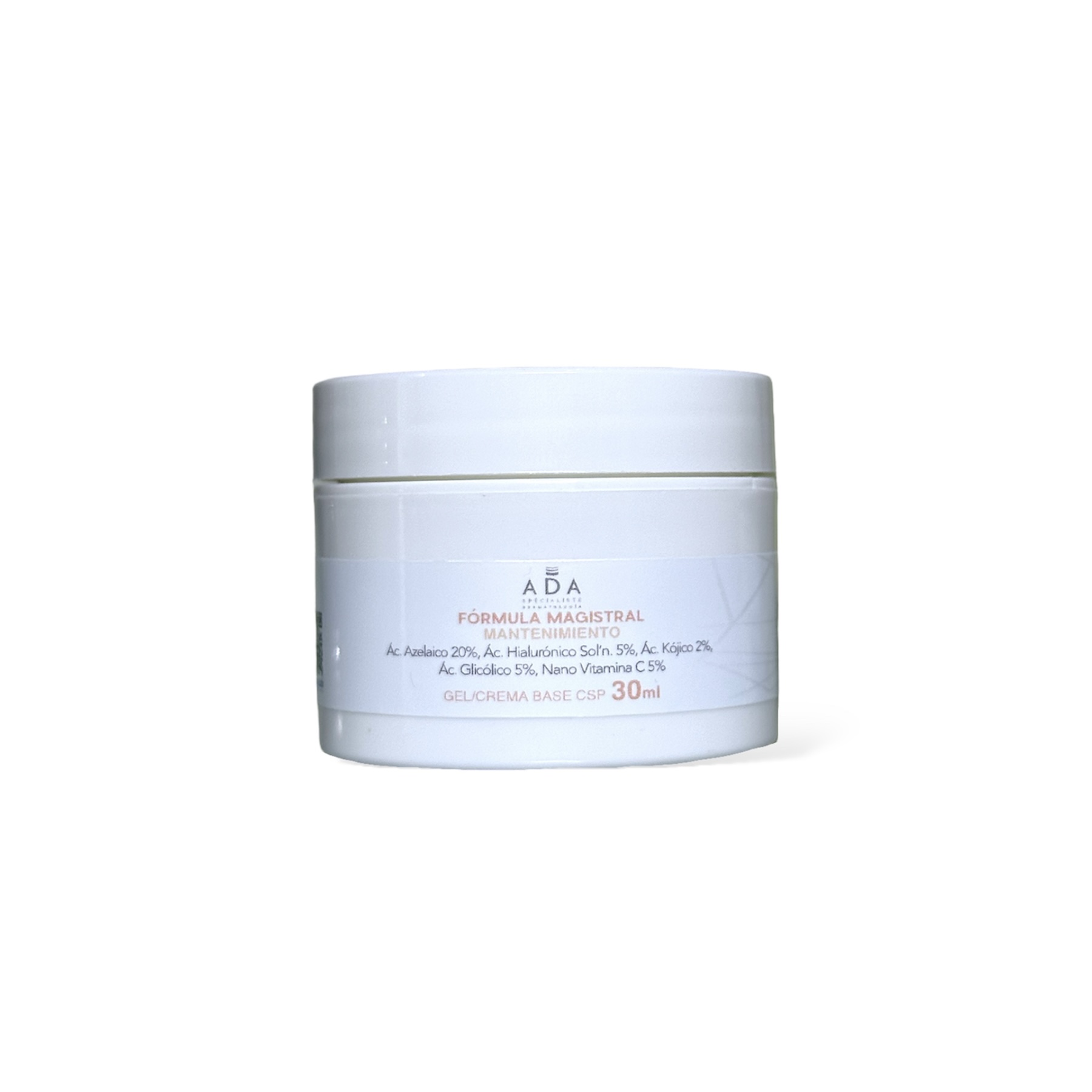 Fórmula magistral con Ácido Azelaico 20%, Ácido Hialurónico 5%, Ácido Kójico 2%, Ácido Glicólico 5% y Vitamina C 5%.